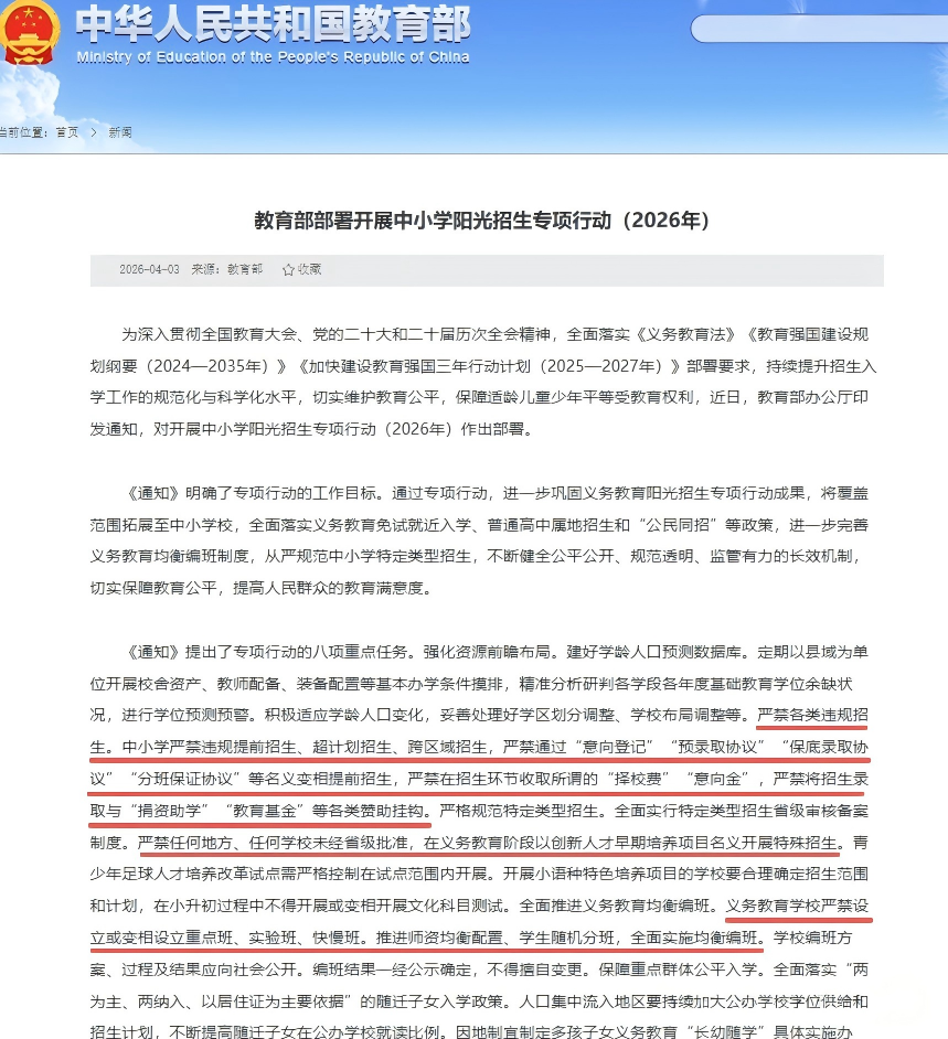 教育部办公厅近日印发通知,对开展中小学阳光招生专项行动(2026年)作出部署,明确义务教育学校严禁设立或变相设立重点班、实验班、快慢班,推进师资均衡配置、学生随机分班,全面实施均衡编班,编班结果一经公示确定,不得擅自变更。据悉,和前两年相比,今年专项行动的覆盖范围从“义务教育”拓展到“普通高中”,贯通义务教育与高中阶段治理链条,明确要求严禁部属高校附中、省属高中、设区的城市高中违规面向县域掐尖招生,形成覆盖中小学全学段的阳光招生体系。根据通知要求,中小学严禁违规提前招生、超计划招生、跨区域招生,严禁通过“意向登记”“预录取协议”“保底录取协议”“分班保证协议”等名义变相提前招生,严禁在招生环节收取所谓的“择校费”“意向金”,严禁将招生录取与“捐资助学”“教育基金”等各类赞助挂钩。在严格规范特定类型招生方面,通知提出,全面实行特定类型招生省级审核备案制度。严禁任何地方、任何学校未经省级批准,在义务教育阶段以创新人才早期培养项目名义开展特殊招生。青少年足球人才培养改革试点需严格控制在试点范围内开展。开展小语种特色培养项目的学校要合理确定招生范围和计划,在小升初过程中不得开展或变相开展文化科目测试。此外,通知还要求加快推进户籍、房产、居住证、社保、学籍等入学相关信息的互通共享。制订“教育入学一件事”办事指引清单,线上业务办理实现报名、审核、录取等“一网通办”。线下业务办理简化表格填写和证明材料提交,实现“只进一门”。鼓励有条件的地方探索利用数字化手段提供政策解答、报名指引等智能咨询服务。为了确保各项要求落到实处,教育部将继续在中国教育督导微信公众平台设立“中小学违规招生问题”专栏,各地县级教育行政部门必须公开招生热线,对群众反映的问题建立台账、逐项核查、限期反馈。